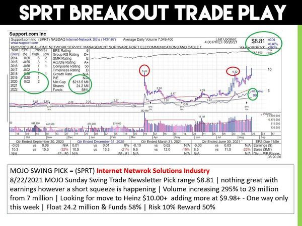 This is not out of the normal as the 8/22 newsletter was $SPRT picked at $8.81 went to $59.00 within 5 days. New picks coming out this Sunday night.