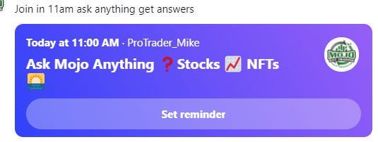 MOJO Spaces Twitter 11am Liveπ΄ Join in 11am ProTrader_MikeNov 16, 20212ShareJoin in 11am ProTrader_Mike @ProTrader_MikeJoin in 11am ask anything get answers https://t.co/gEi4RxGbc1